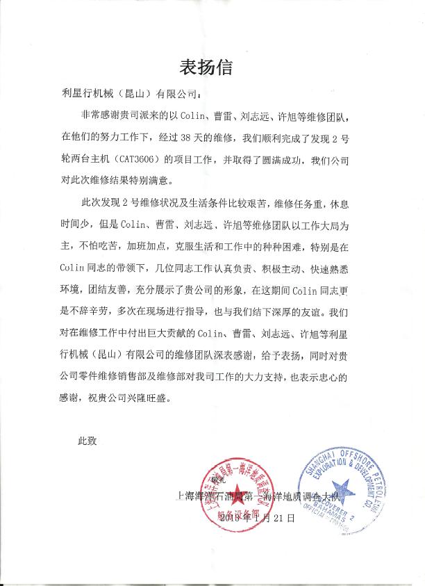 以客户为中心不仅是710公海寰宇机械的价值观之一,更是服务部门的核心原则。这是一封来自上海海洋石油局的感谢信,他们对710公海寰宇机械维修团队给予了高度评价,通过向客户提供优质服务,公司也展现出积极主动、团结合作的良好形象,在客户的肯定..